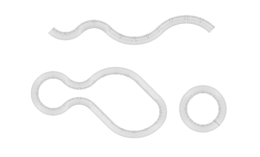 Disponibile 2 module curbate cu raze diferite: R1500mm 90º (curbă închisă), R2500mm 45º (curbă deschisă) și 1 modul drept de 1.800 mm lungime, toate putând fi combinate între ele.